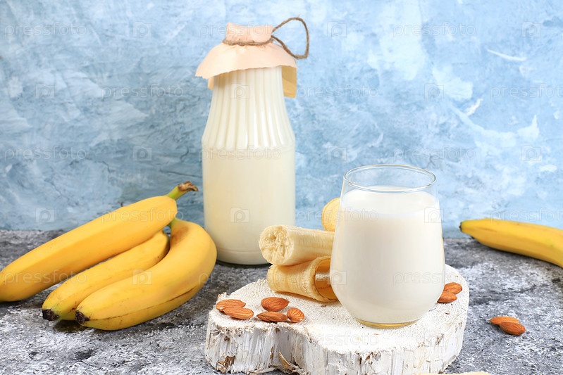 Банановое веганское альтернативное молоко без лактозы и глютена, без аллергии, концепция здорового питания, поддержание здоровой микрофлоры кишечника, диетическое питание, потеря веса, избирательная направленность