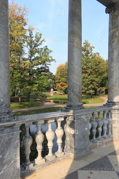 Россия, Санкт-Петербург, 22 сентября 2018 г., Екатерининский парк. На фото Мраморный мост в Царском Селе на фоне осеннего парка с красными листьями