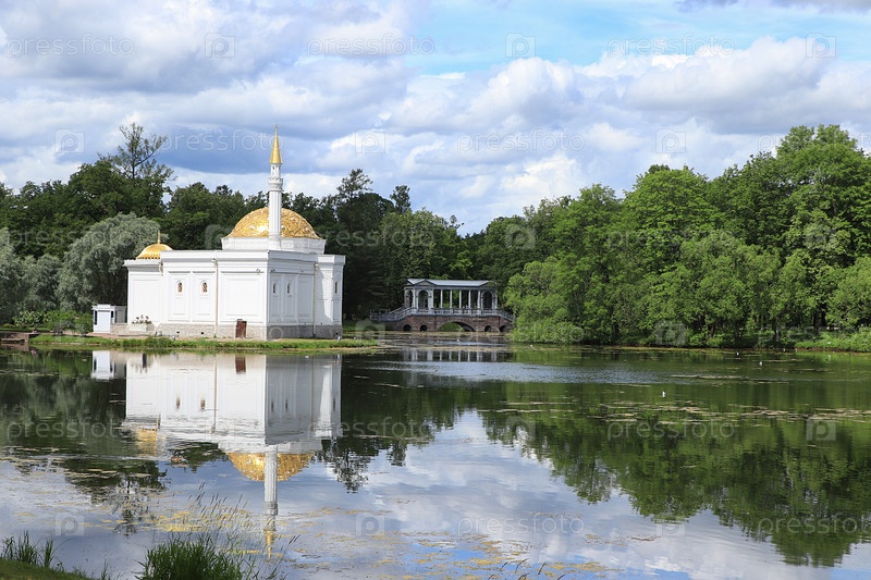 Россия, Санкт-Петербург, 10 июля 2020, Екатерининский парк. На фото турецкая баня на берегу озера в центральной части Екатерининского парка в городе Пушкин