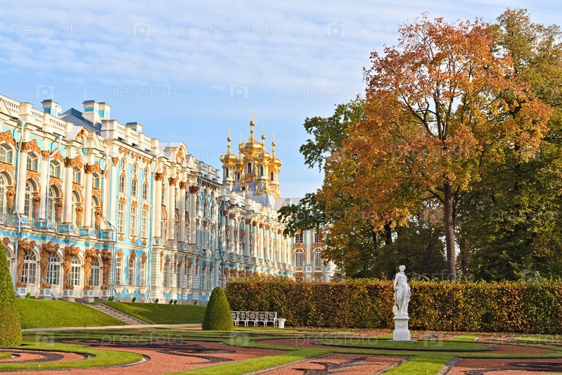 Россия, Санкт-Петербург, 28 сентября 2019 года, Екатерининский парк. На фото Екатерининский дворец в Царском Селе на фоне осеннего парка с красными листьями, вид из Камероновой галереи