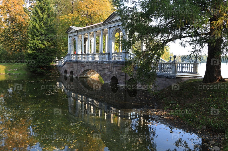 Россия, Санкт-Петербург, 22 сентября 2018 г., Екатерининский парк. На фото Мраморный мост в Царском Селе на фоне осеннего парка с красными листьями и отражением
