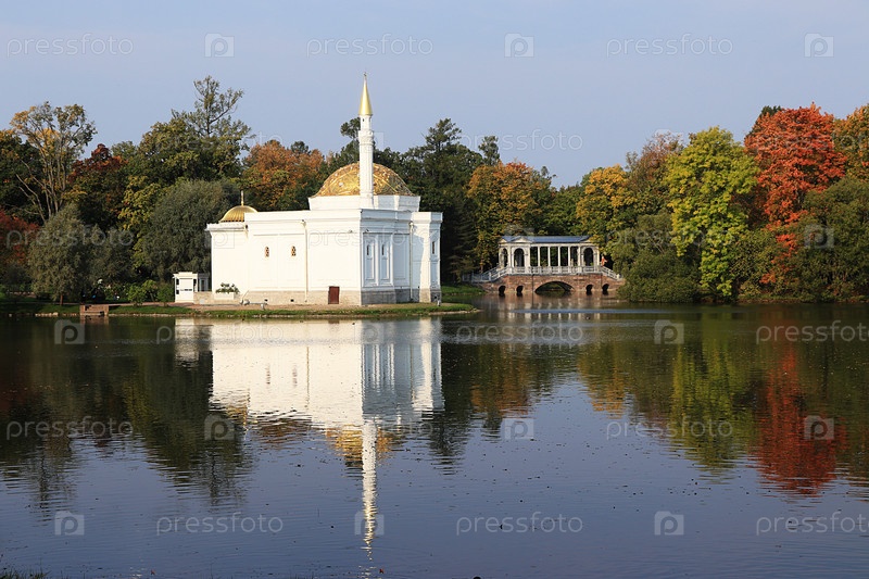 Россия, Санкт-Петербург, 22 сентября 2018 г., Екатерининский парк. На фото Турецкая баня и Мраморный мост в Царском Селе на фоне осеннего парка с красными листьями и отражением в озере