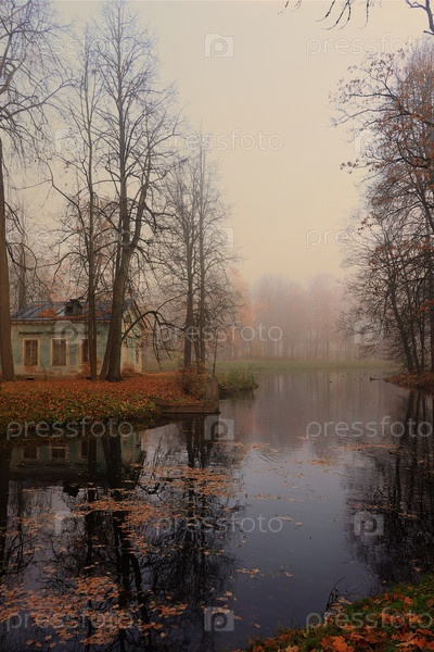 Россия, Санкт-Петербург, 17 октября 2018 г., Александровский парк. На фото осенний пруд с опавшими листьями и Детский домик в густом тумане. Красота Октябрьского леса
