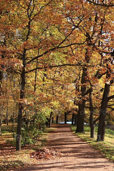 Октябрьский осенний парк в России, дубовая аллея с красными листьями. Красивый яркий пейзаж в парке, времена года, сезон золотой осени, фон, Царское Село