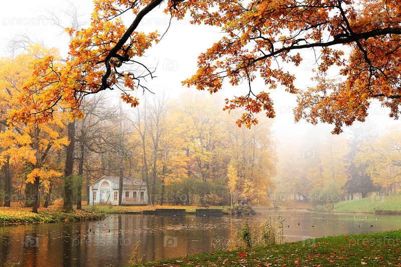 Россия, Санкт-Петербург, 13 октября 2018 г., Александровский парк. На фото осенний пруд с яркими листьями и Детский домик в осеннем тумане. Красота Октябрьского леса