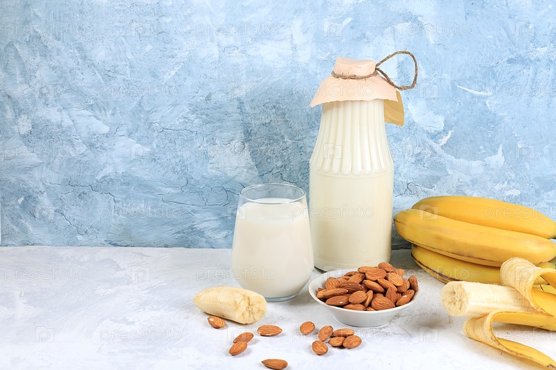 Банановое веганское альтернативное молоко без лактозы и глютена, без аллергии, концепция здорового питания, поддержание здоровой микрофлоры кишечника, диетическое питание, потеря веса, избирательная направленность