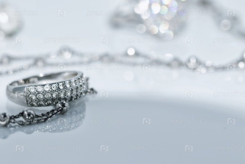 Серебряное кольцо с драгоценными камнями и тонкой серебряной цепочкой