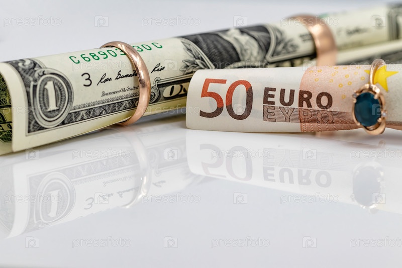 Банкноты в 1 доллар и 50 евро продаются в разных золотых кольцах