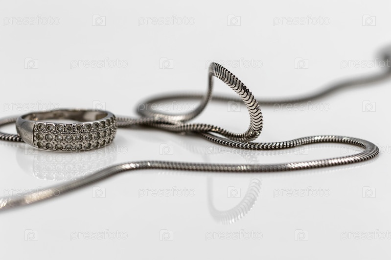 Серебряное кольцо с драгоценными камнями и тонкой серебряной цепочкой