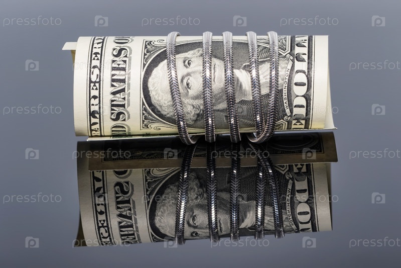Банкнота в один доллар обернута вокруг серебряной цепочки со змеиной сеткой