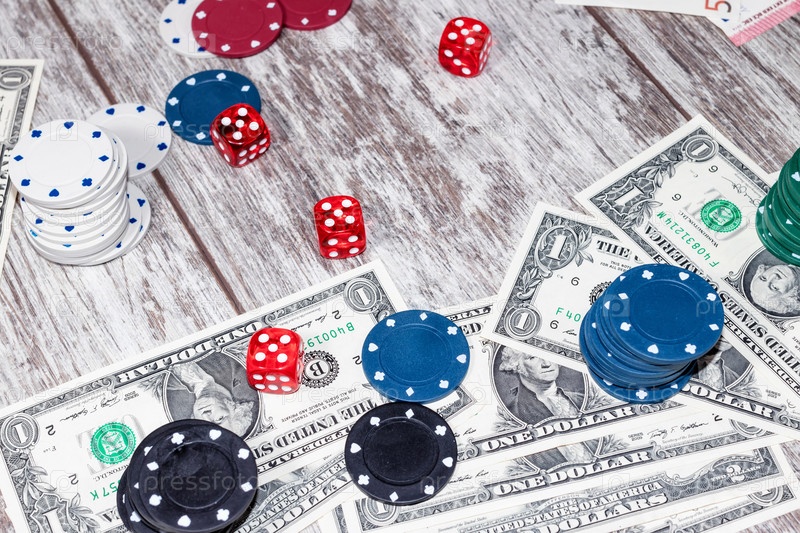 Игровой стол с разбросанными фишками, деньгами и костями
