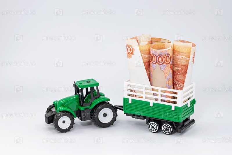 Игрушечный зеленый сельскохозяйственный трактор перевозит в прицепе пятитысячные купюры, свернутые в трубу
