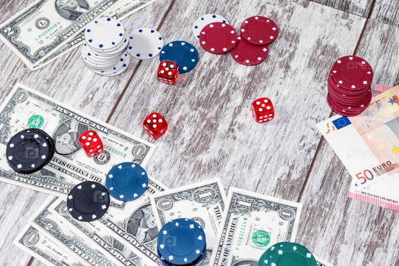 Игровой стол с разбросанными фишками, деньгами и костями