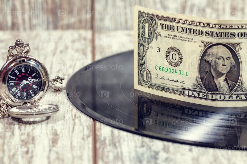 Долларовая купюра стоит на старой виниловой пластинке с музыкой