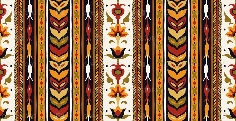 Геометрический дамасский орнамент. Икат границы. Этническая вышивка с листьями и монограммами. Племенная векторная текстура. Бесшовный народный узор в ацтекском стиле. Индийский, скандинавский, цыганский, мексиканский, африканский ковер