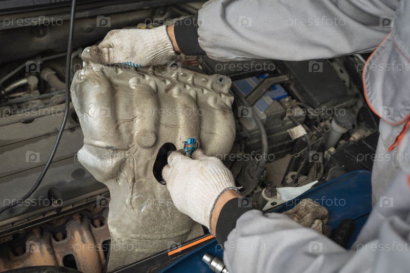 Механик снял защиту коллектора для дальнейшего обслуживания автомобиля