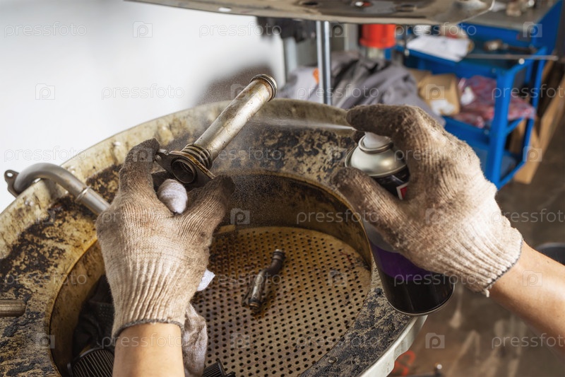Автомеханик использует спрей для очистки деталей теплообменника автомобиля