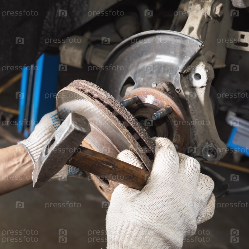 Автомеханик снимает старый ржавый тормозной диск, чтобы заменить его новым