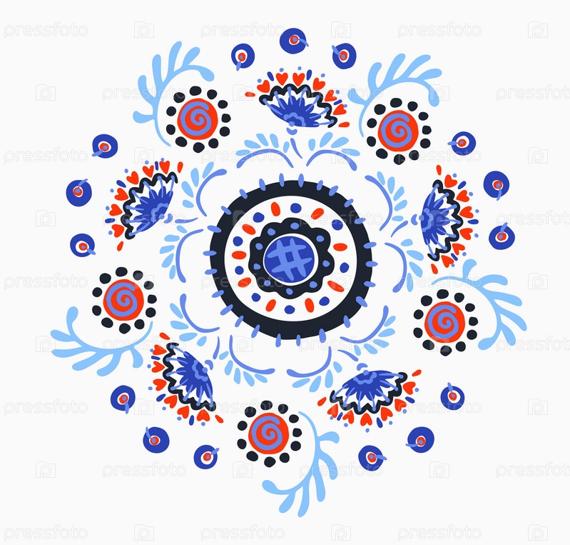 Набор этнических элементов. Бордюр представляет собой полосу с цветами, листьями, ветками, вензелями. Народная вышивка. Славянский, украинский, русский мотив. Хохлома, матрешка, дымковская игрушка. Мексиканский, индийский, цыганский ковер. Вязаное кружево