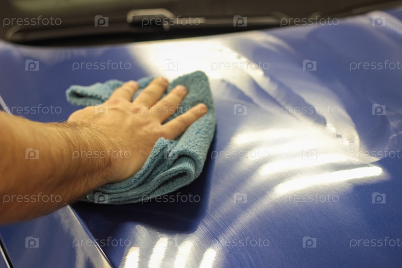 Работник службы полирует автомобиль тканью из микрофибры. Детализация автомобиля - мужчина держит в руке мягкую микрофибру и полирует кузов. Селективный фокус. Концепция правильного мытья автомобилей и ухода за автомобилем