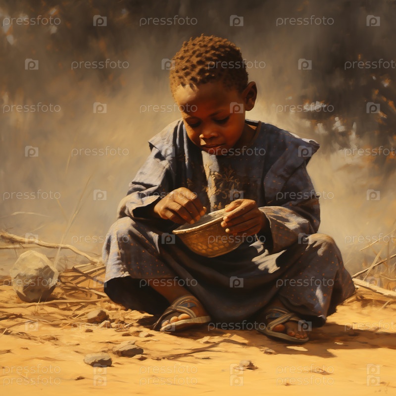 Африканский голодный мальчик сидит на земле и ест. Генеративный ИИ. Иллюстрация высокого качества