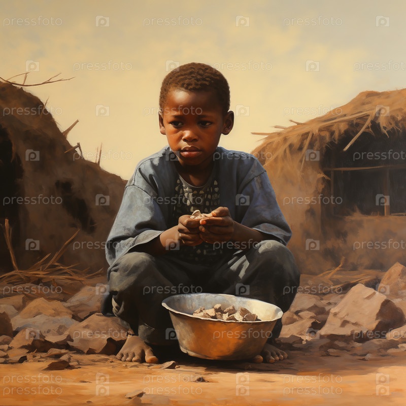 Африканский голодный мальчик сидит на земле и ест. Генеративный ИИ