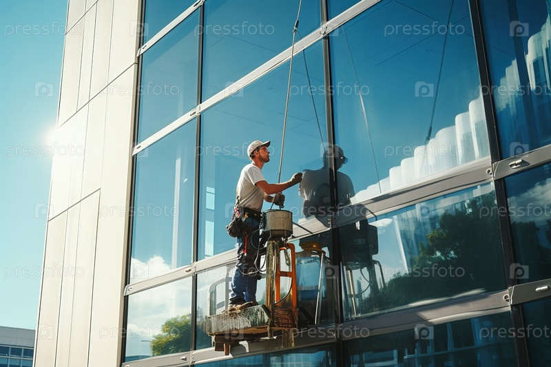 Профессиональный промышленный альпинист моет окно на подъемной платформе. Генеративный ИИ