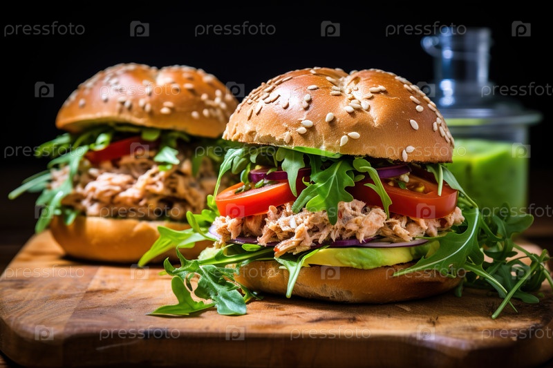 Два аппетитных мясных бургера с авокадо и помидорами на разделочной доске. Генеративный ИИ