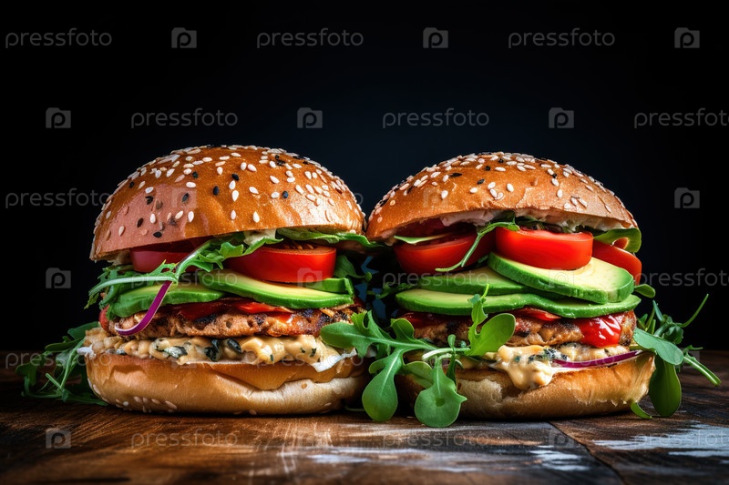 Два аппетитных мясных бургера с авокадо и помидорами на разделочной доске. Генеративный ИИ
