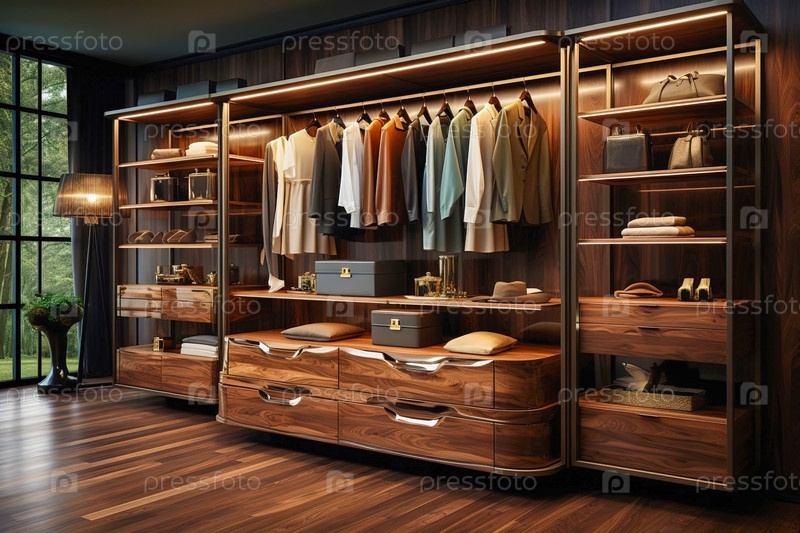 Современная, стильная гардеробная в темных тонах. Генеративный ИИ