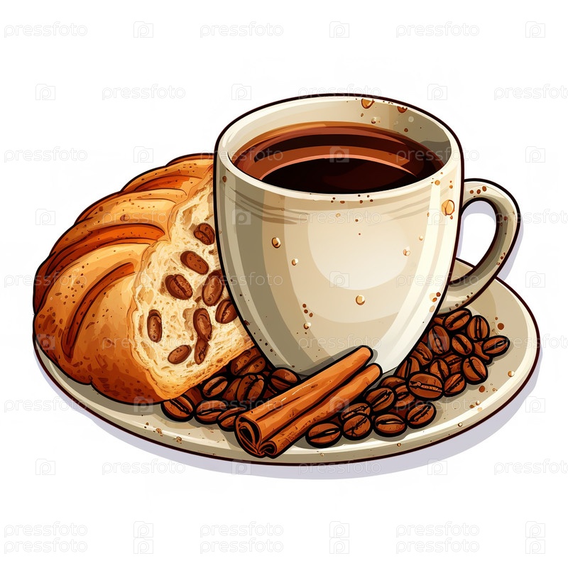 Кружка кофе с круассаном на белом фоне. Генеративный ИИ