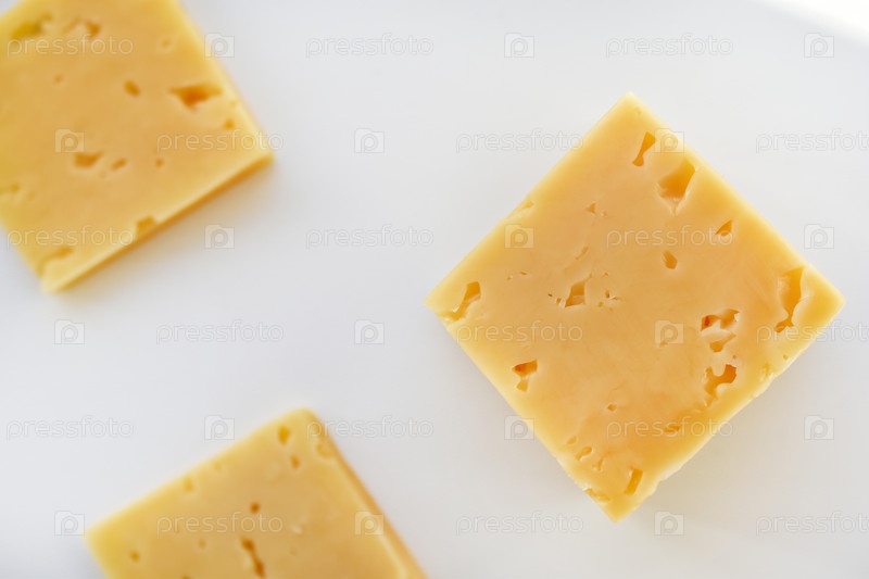 Желтые кусочки сыра на белом фоне. Квадратный сыр. Вкусная сырная закуска