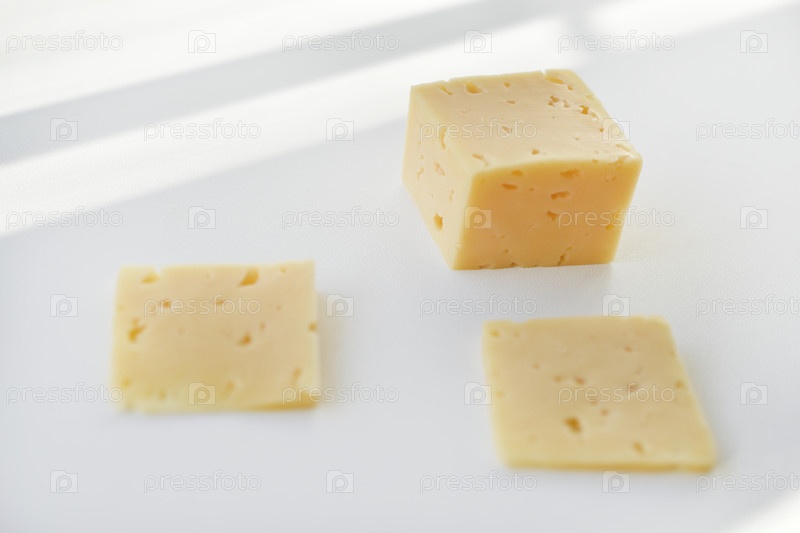 Желтые кусочки сыра на белом фоне. Квадратный сыр. Вкусная сырная закуска