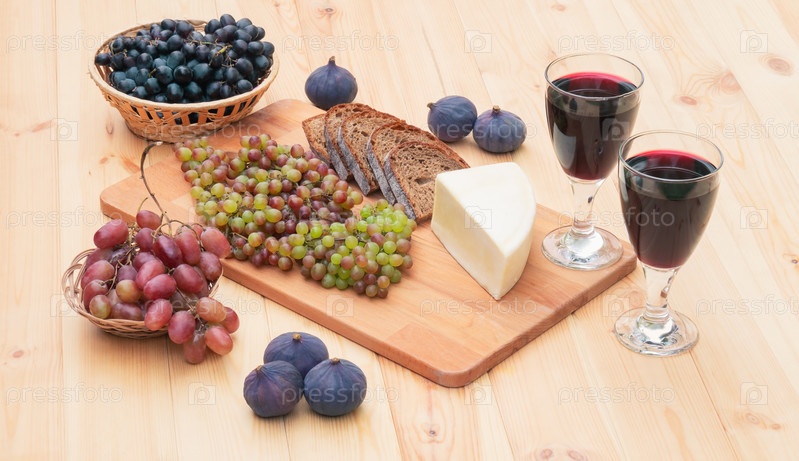 Красное вино, инжир, сыр, виноград и хлеб на деревянном столе