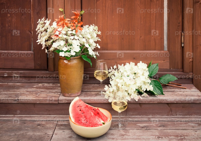 Букет в глиняной вазе, арбуз и белое вино на ступеньках деревенской деревянной лестницы