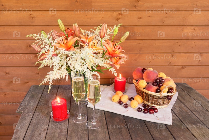 Лилии и цветы астильбы, шампанское, свечи и плетеная корзина с фруктами на состаренном деревянном столе. Выборочный фокус