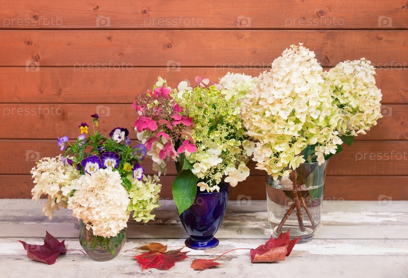 Осенние цветы гортензии и анютины глазки в вазах и осенние кленовые листья на старом деревянном столе