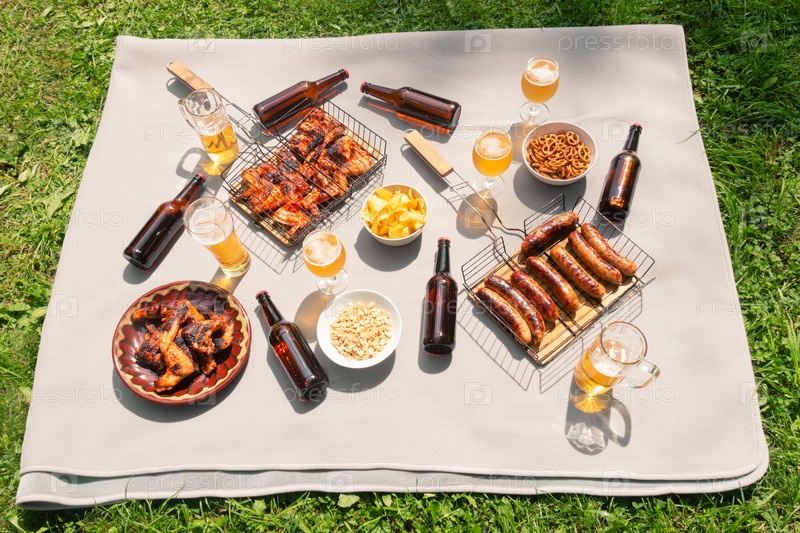 Пикник с жареными куриными крылышками, жареными сосисками, пивом и пивными закусками в солнечный день. Вид сверху