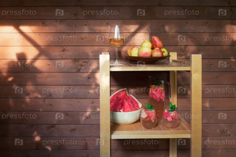 Белое вино, фрукты, арбуз и арбузный лимонад стоят на деревянных полках