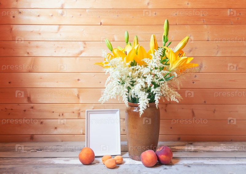 Букет желтых лилий и белой астильбы в глиняной вазе, пустой рамке и свежих фруктах рядом