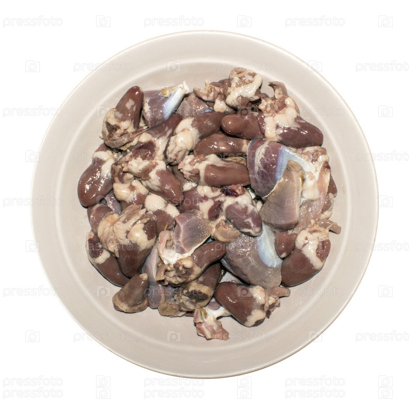 Сырые куриные сердечки и желудки.Сырые куриные сердечки и желудки.Фон из куриных потрохов