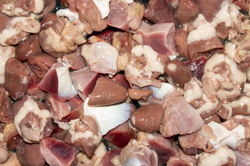 Сырые куриные сердечки и желудки.Сырые куриные сердечки и желудки.Фон из куриных потрохов