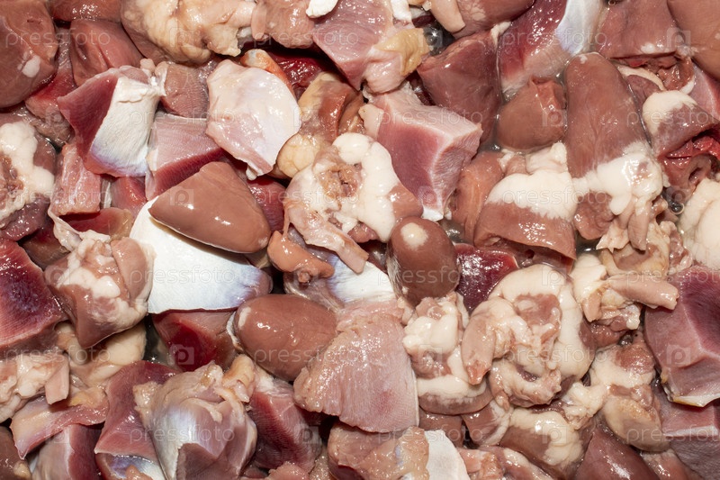 Сырые куриные сердечки и желудки.Сырые куриные сердечки и желудки.Фон из куриных потрохов