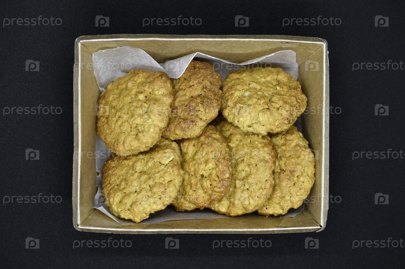 Песочное печенье в картонной коробке на черном фоне. Вкусное печенье в коробке. Овсяное печенье