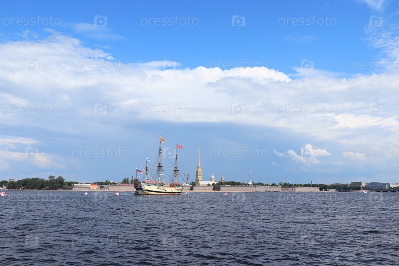 Россия, Санкт-Петербург, 19 июля 2020 г. Военный бриг Полтава и Петропавловская крепость в акватории Невы во время парада ко Дню ВМФ