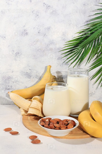 Банановое веганское альтернативное молоко без лактозы и глютена, без аллергии, концепция здорового питания, поддержание здоровой микрофлоры кишечника, диетическое питание, потеря веса, избирательная направленность