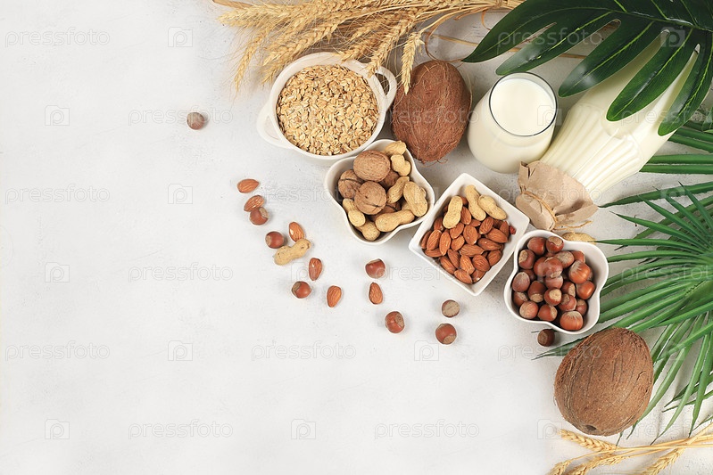 Ассортимент веганских немолочных продуктов на бетонном столе, баннер магазина, растительные альтернативные молочные продукты - молоко, сливки, йогурт, сыр, орехи, рис, овсянка, чечевица, концепция здоровой натуральной пищи, вид сверху, выборочный фокус