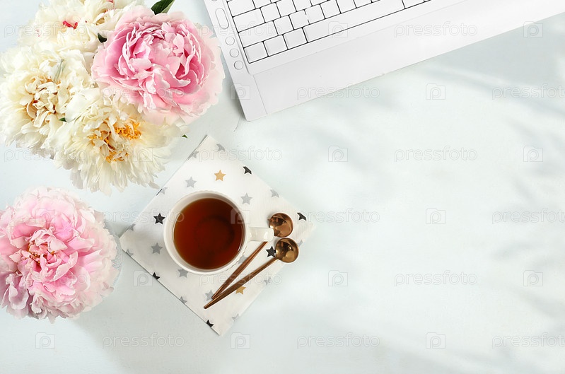 Рабочий стол современной женщины, домашний офис. Компьютер, цветы пиона и чашка чая на солнечном столе с длинными тенями, концепция образа жизни, удобная работа дома, шаблон для дизайна, плоская планировка,