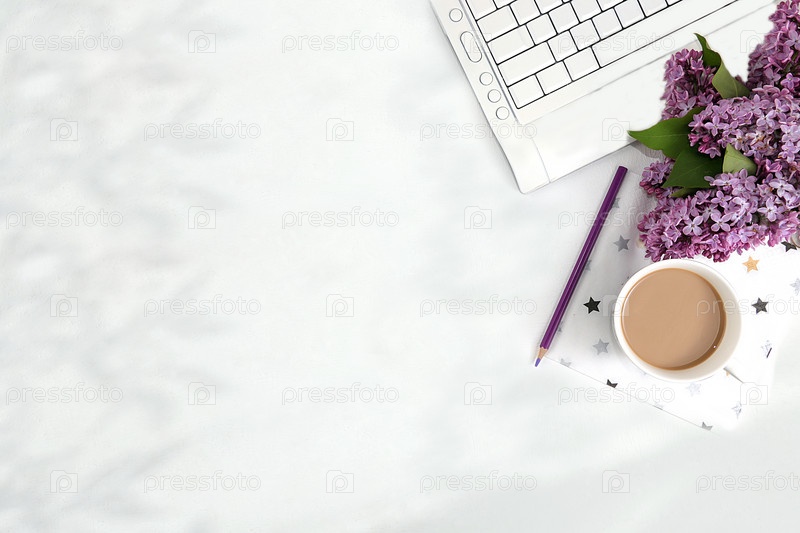 Компьютер, сиреневые цветы и чашка кофе на светлом столе. Рабочий стол современной женщины, домашний офис. Минимальная бизнес-концепция, домашний комфорт и образ жизни, шаблон для дизайна, плоская планировка,