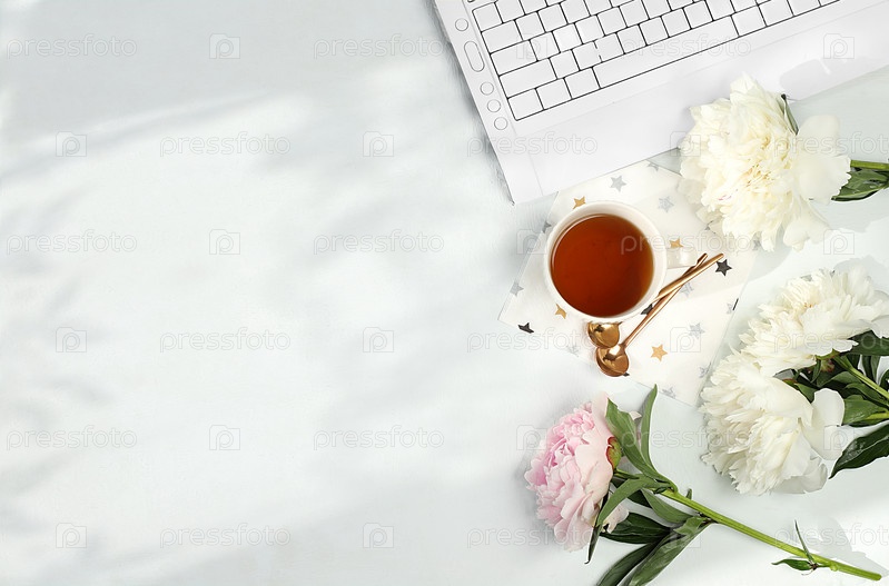 Компьютер, весенние цветы и чашка кофе на светлом столе. Рабочий стол современной женщины, домашний офис. Минимальная бизнес-концепция, домашний комфорт и образ жизни, шаблон для дизайна, плоская планировка,